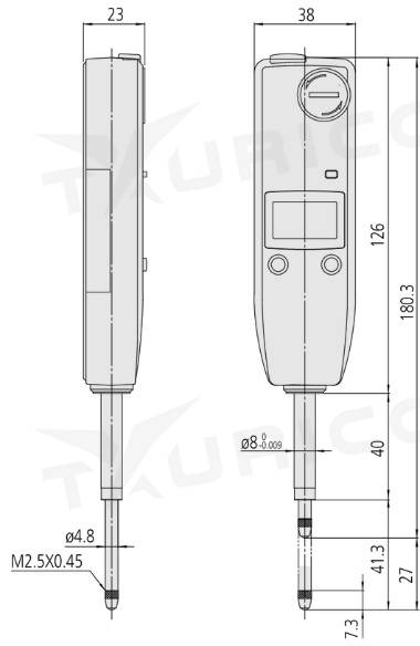 Úzké provedení úchylkoměru s rozsahem měření 25,4 mm.
