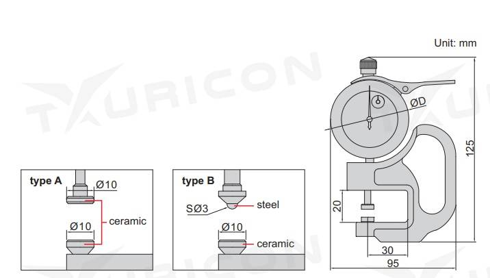 Mechanický hrubkomer. Typ A - obe meracie plochy jsou ploché a keramické. Typ B - je v provedení s horním kuličkovým dotekem z ocele a spodným tanierovým dotekom z keramiky.
