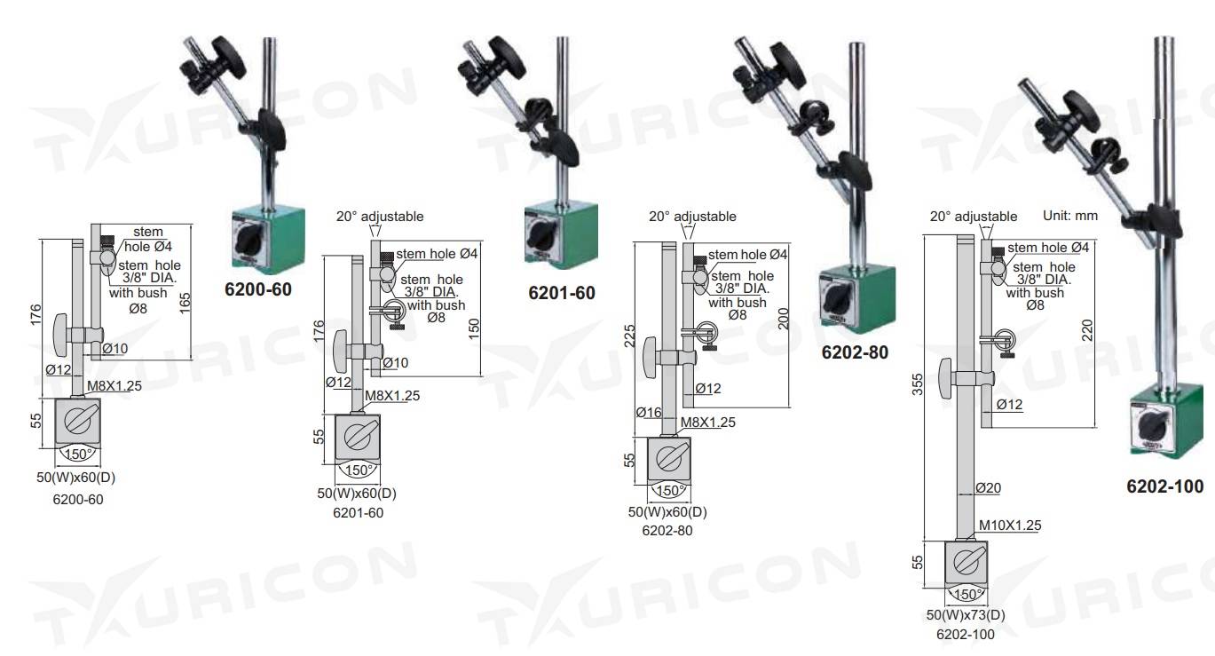 Magnetic stand with a magnetic force of 60 kgf and a clamping diameter of 4 or 8 mm.