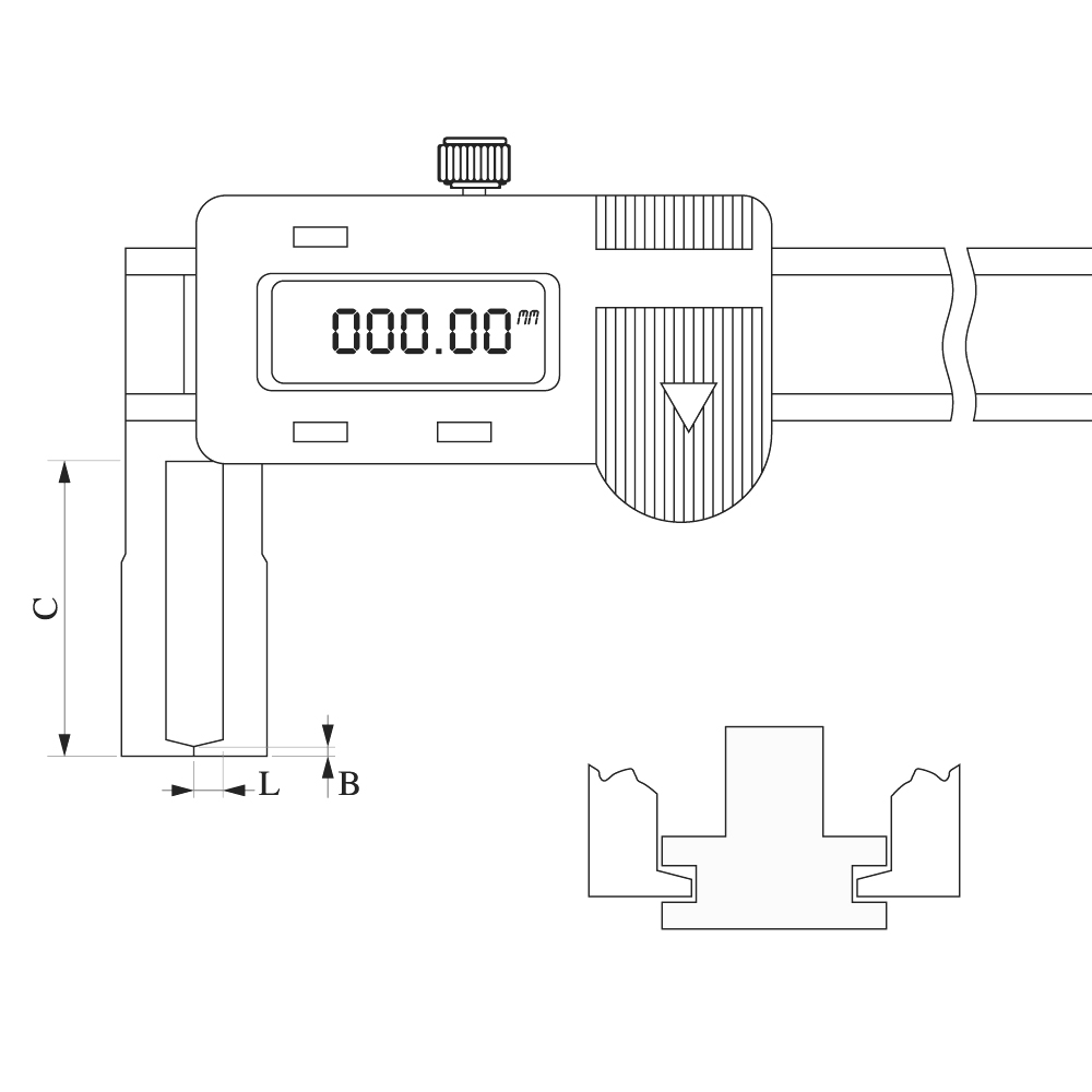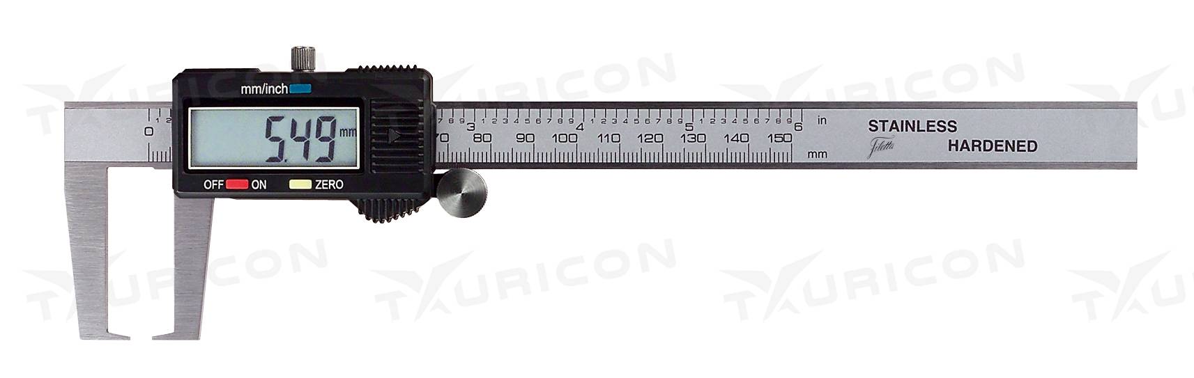 This caliper is equipped with inward angled V-shaped measuring jaws for external measurement.